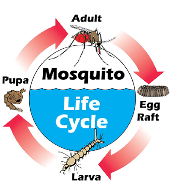 Mosquitoes are holometabolous insects and therefore grow through an egg, larva, pupa to adult stage. The larvae and pupae are aquatic, the adults are free flying. At 80° F the larva goes through four larval instars in about 4 days before pupating. The pupa takes three days before the adult emerges. Adult females live several weeks if given a source of sugar. Males usually live less than a week.
